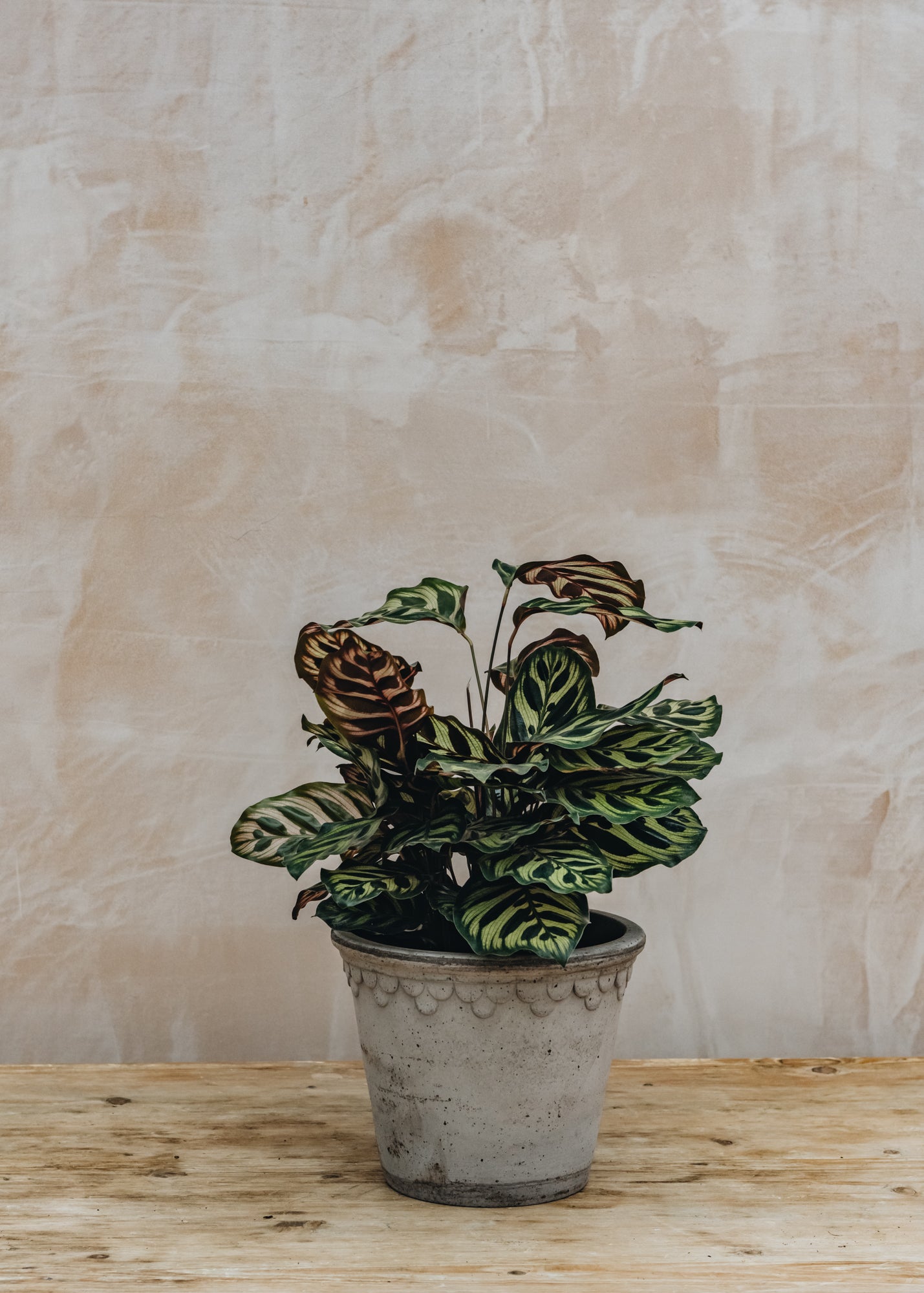 Garsėjo savo kontrastingais žaliais ir kaštoniniais lapais, primenančiais povo plunksnas ar vitražinius langus, minkšti Kalathea makoyana lapai sėdi ant lieknų, aukštų stiebų. Šis augalas suteiks jūsų interjerui dinamiškumo pojūtį. Atminkite, kad puodo dangtis neįtrauktas.